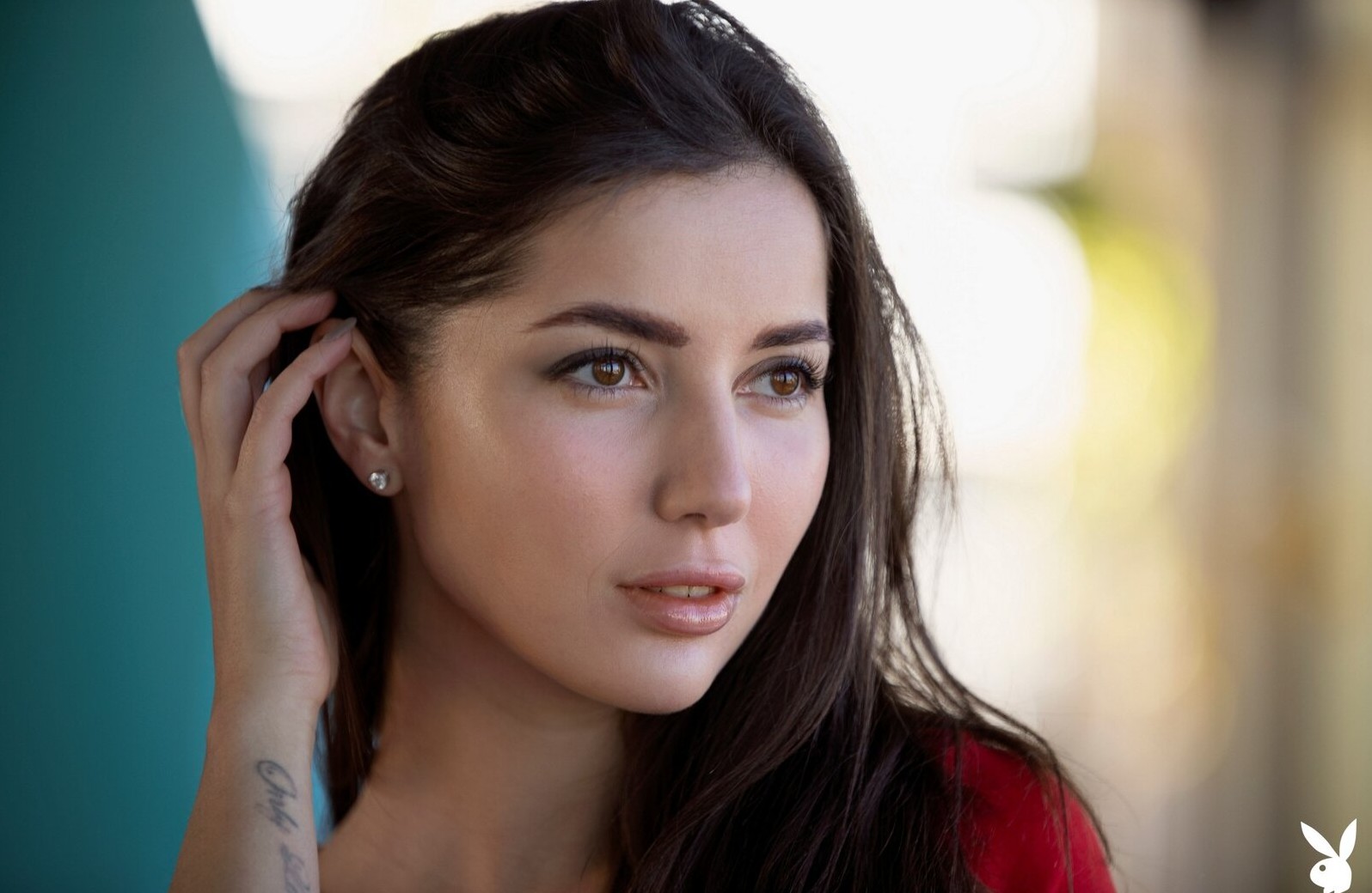 Сексуальна шикарна брюнетка еротично позує перед камерою всім тілом і поступово зняла з себе джинси і обтягуючі червоне боді. Оголена красуня з збудливо гарячим тілом чуттєво випинає свою соковиту пружні груди і мигцем засвічує свою апетитну попку і гладким лобком.
