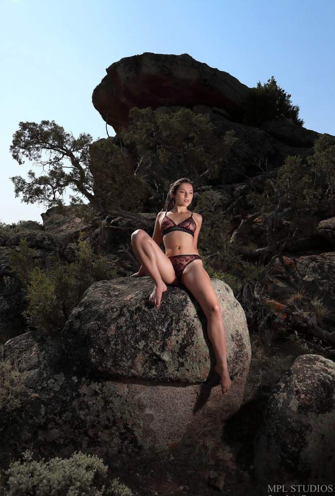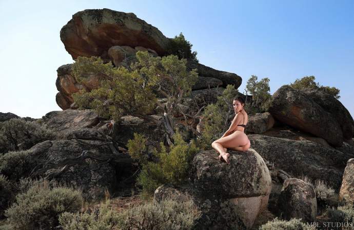 Поступово знявши з себе мереживне нижню білизну, пристрасна брюнетка збудливо засвітила на камеру свій підстрижений волосатий лобок. Чуттєво вигинаючись всім тілом на тлі природи, оголена дівчина з мініатюрними титьки розслаблено лежить на великих скелях, мигцем засвечівая соковиті принади.