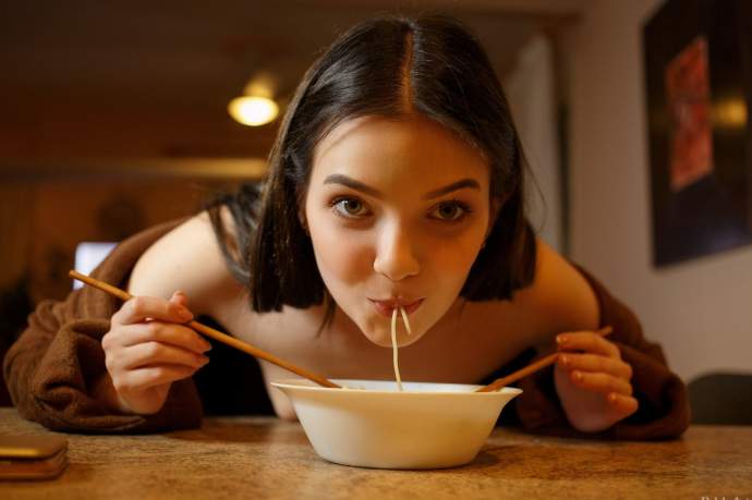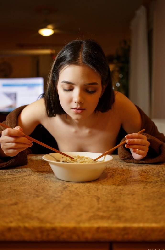 Залишившись вдома одна, молода голодна дитинко з голими маленькими титьки на показ перед камерою повільно і еротично їсть локшину, спокусливо засмоктуючи її в рот. Знявши з себе довгий халат, оголена брюнетка розслаблено розвалилася на стільці з широко розсунутими ніжками, розкриваючи всім свою голену кицьку з волохатим пухнастим лобком.