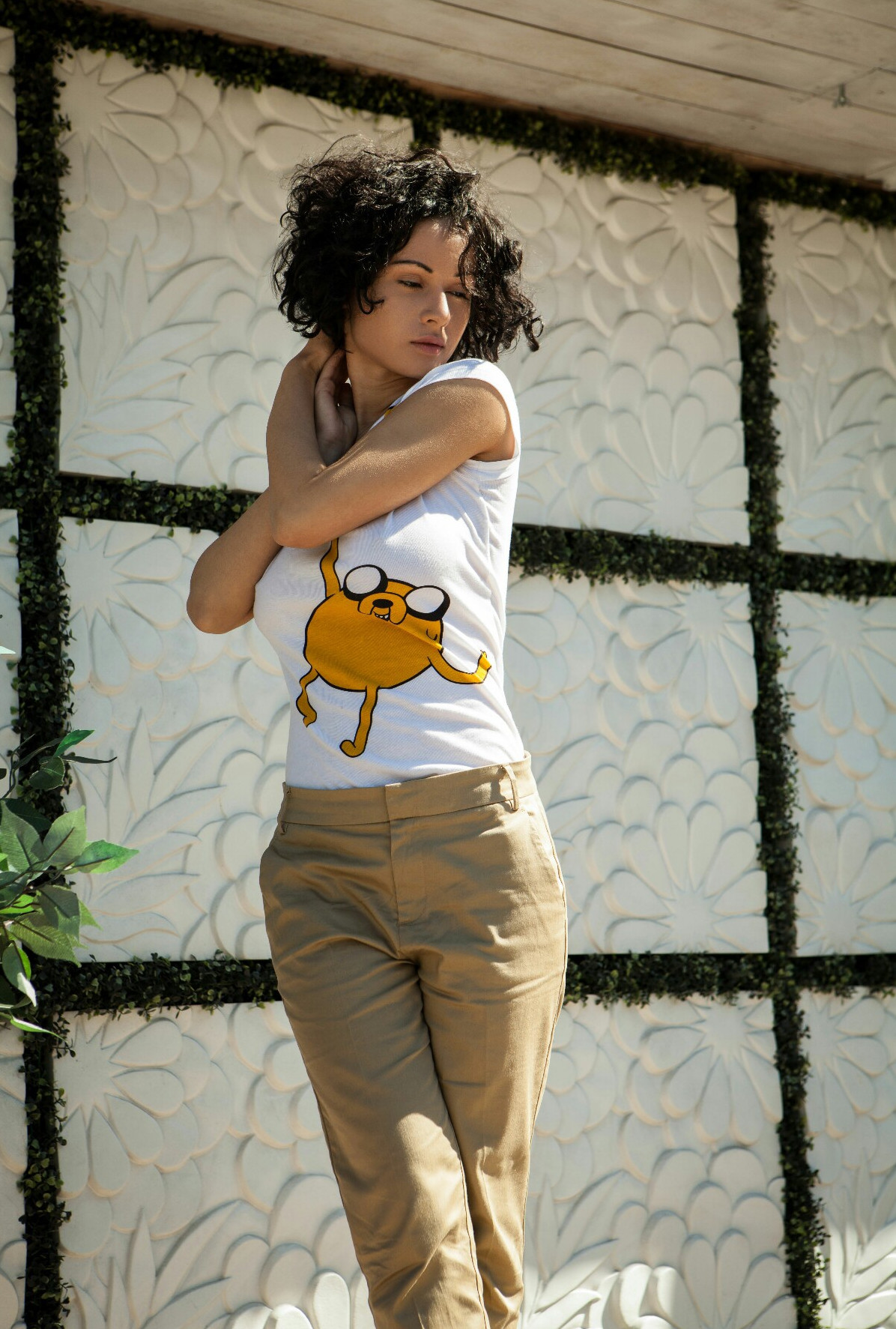 Повільно стягнувши з себе обтягуючий футболку і штани, кучерява брюнетка з великими пружними буферами поступово роздяглася перед камерою, виставивши на показ своє сексуальне гаряче тіло і у всій красі показавши нам свою голену промежину з підстриженою волохатих піськи.
