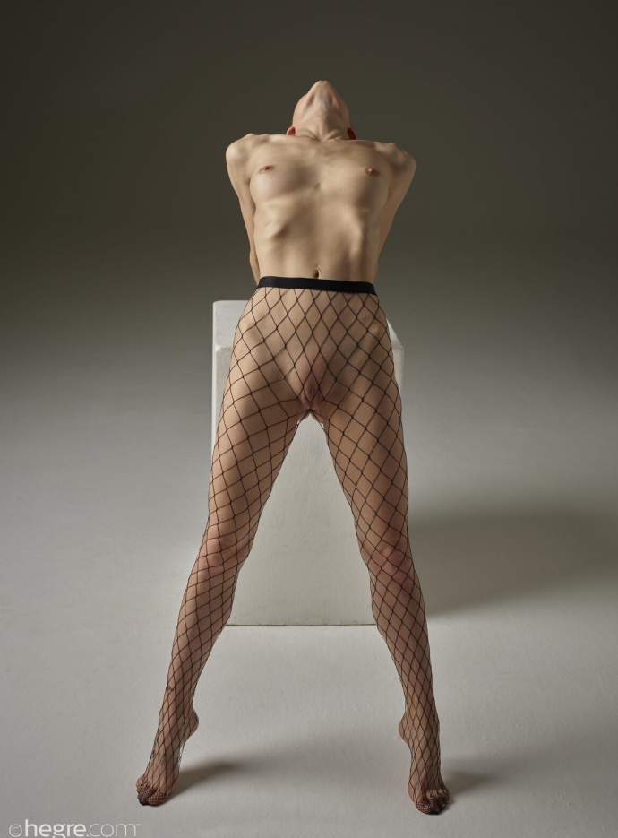 Витончена гнучка дівчина в розпусних сітчастих колготках спокусливо згинається всім своїм струнким тілом в різних відвертих позах. Гола тьолка чуттєво виставляє на показ свої пружні натуральні сиськи, а потім грайливо засвічує свою апетитну підтягнуту дупу і голену ніжну піськи.