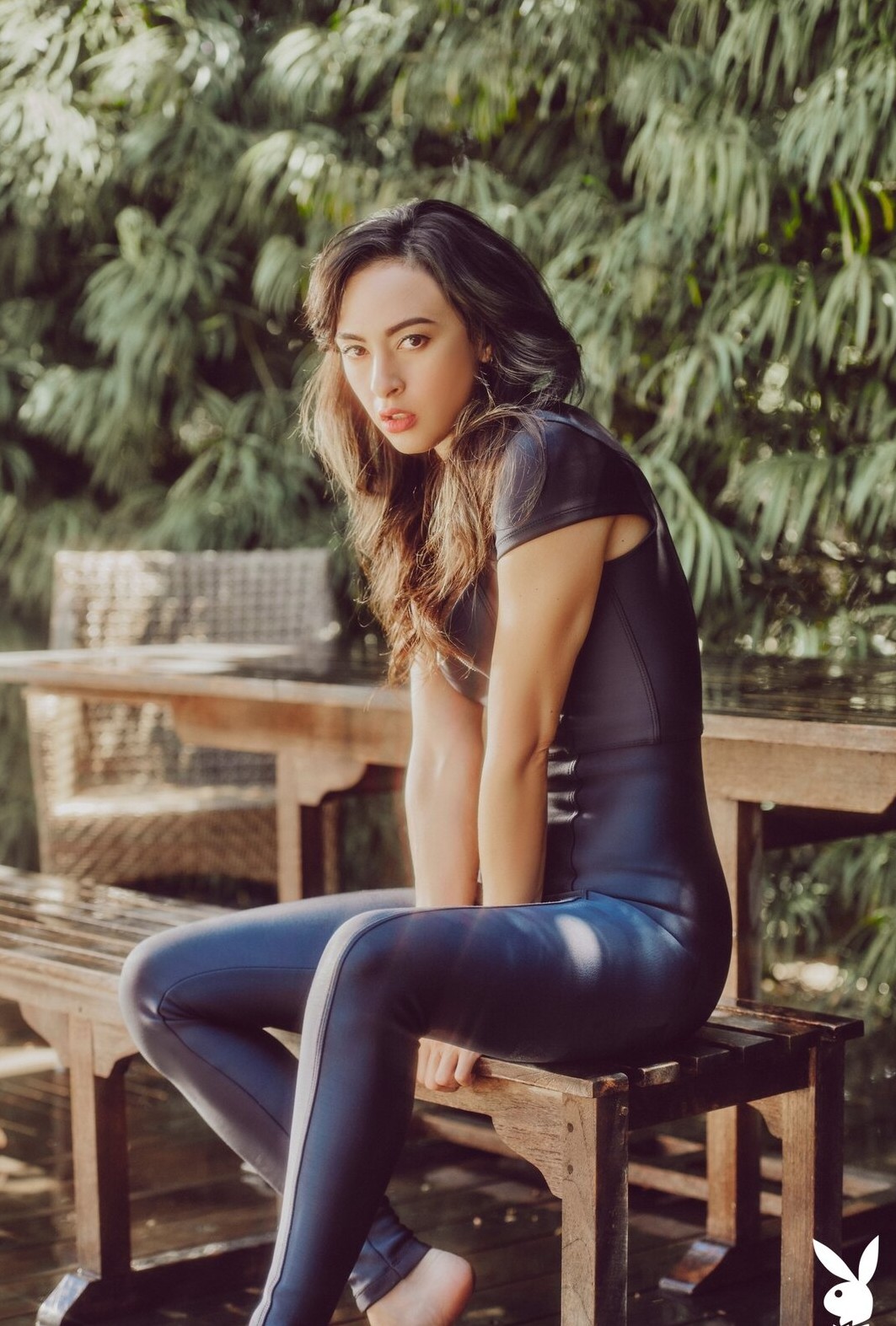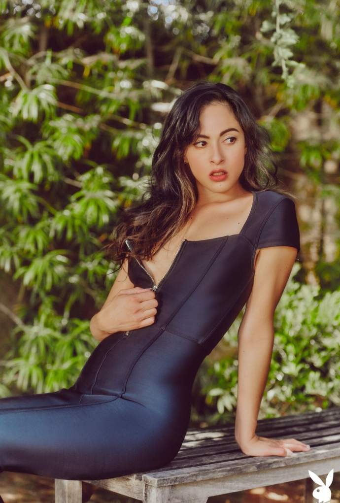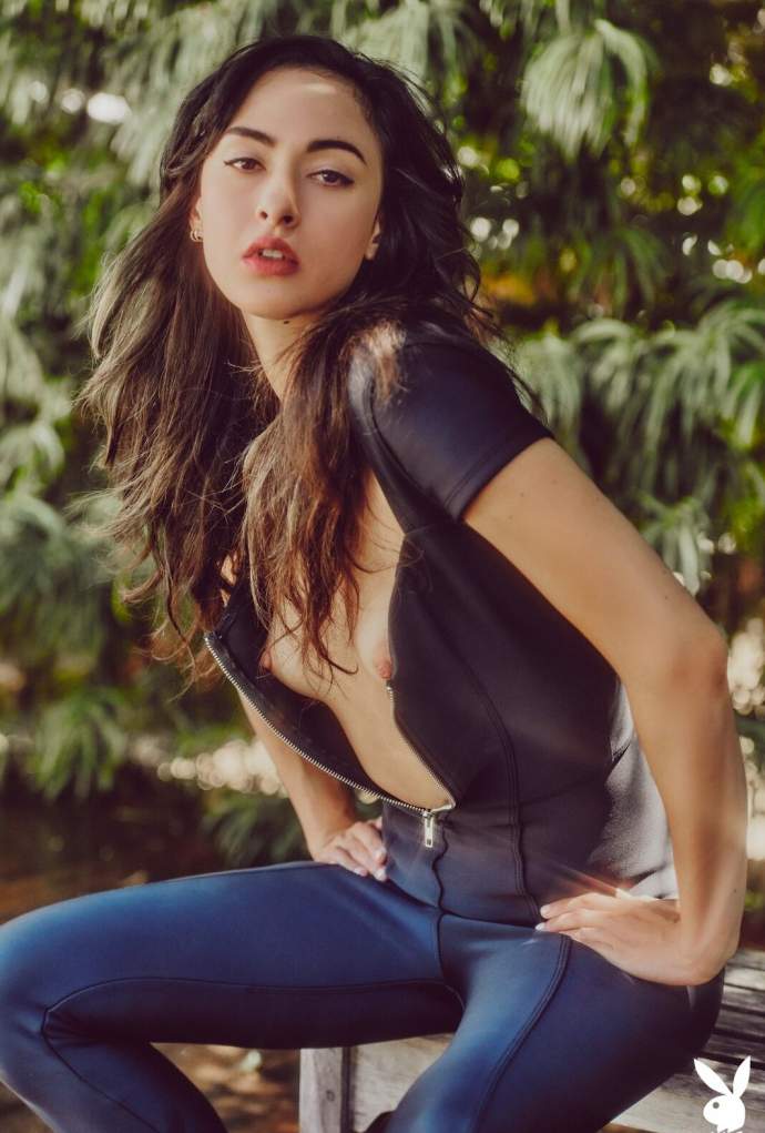 Чуттєво позуючи перед камерою, гаряча модель поступово оголила своє струнке сексуальне тіло, повільно знімаючи з себе обтягуючий шкіряний наряд. Гола брюнетка з маленькими Титечко розслаблено лягає біля басейну і розпусна звивається всім тілом, виставляючи на показ м'яку попочку.