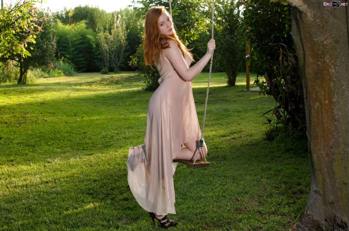 Розважаючись на гойдалки в парку, ніжна рудоволоса дівка в легким довгій сукні з радістю еротично позує і будує очки. В майбутньому сексуальна стройняшка встає і повертаючись спиною трохи засвічує подкаченний і досить велику попочку, відчуваючи при цьому збудження.