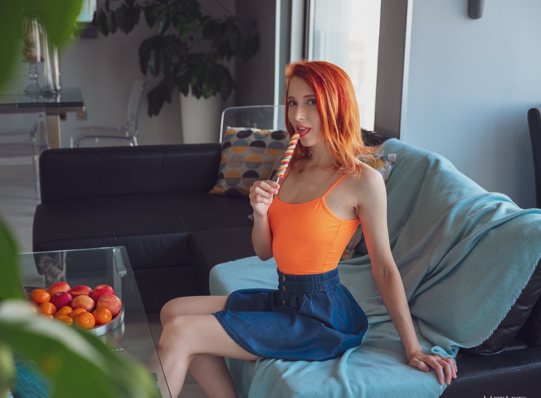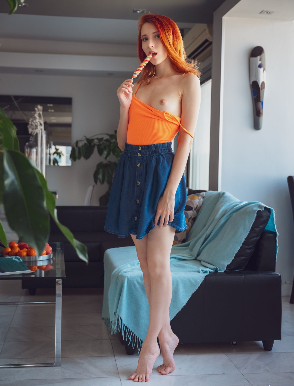 Добравшись до улюбленого ласощі, солодка дитинко чуттєво смокче великий довгий льодяник, представляючи на його місці гарячий поточний член. Розпусна руда бестія знімає з себе одяг і, пристрасно стискаючи свою маленькі пружні Титечко, пестить і гладить свою голену ніжну кицьку гладкою липкою солодкістю.