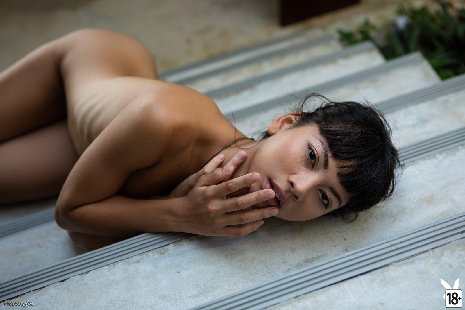 Сексуальная азиатка позирует на лестнице, раздеваясь до гола