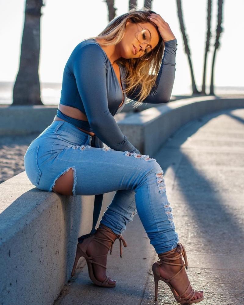 Девушка красотка в рваных джинсах