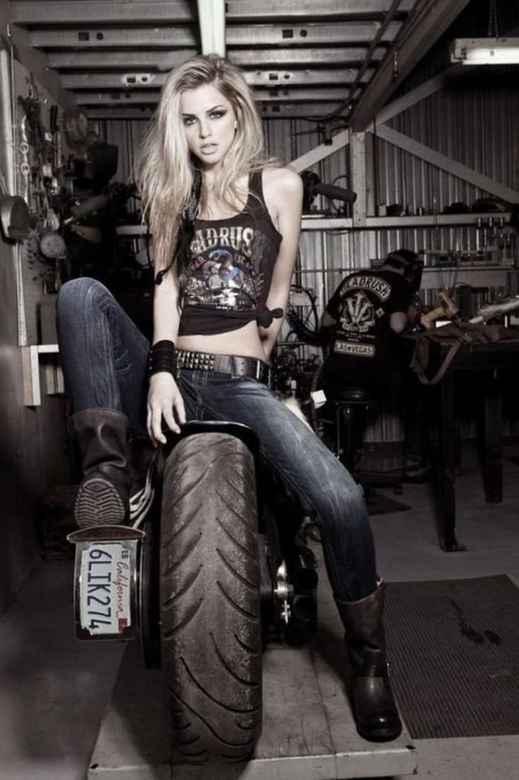 Девушка красотка в коже на байке