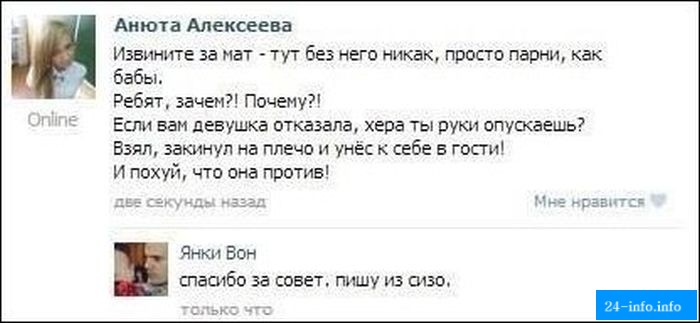 Смешные комментарии из социальных сетей. Часть 2 (32 скриншотов) 28 мая, 2013 3 284 Подборка скринов прикольных комментариев из социальных сетей обо всем на свете ;) Да, есть еще в соц сетях народ с чувством юмора )) 0 Рубрика: Картинки