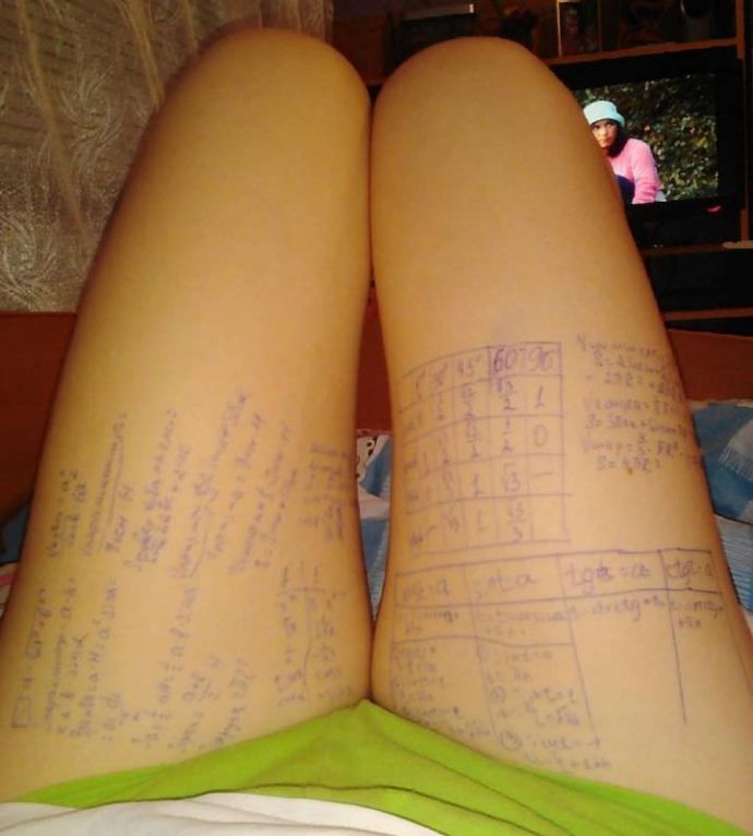 Подсказки к экзаменам на ногах у девушек 08 декабря, 2018 1 837 Уже не за горами экзамены и хитрожопые девушки их могут спрятать вот в таких местах. 0 Рубрика: Картинки