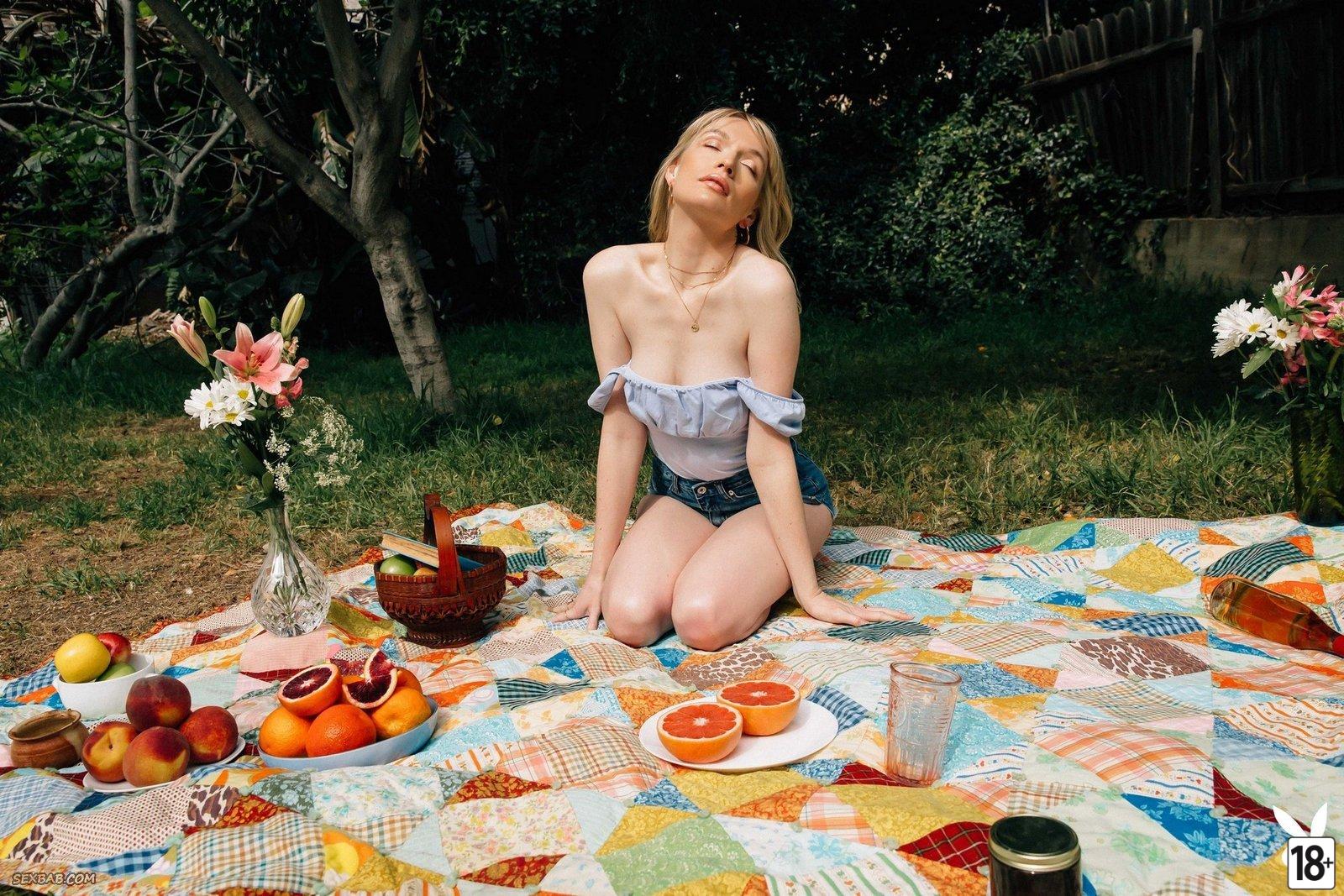 Высокая блондинка-модель раздевается в саду, показывая свое подтянутое тело и естественные груди. Она позирует чувственно, демонстрируя свою красоту и уверенность.…