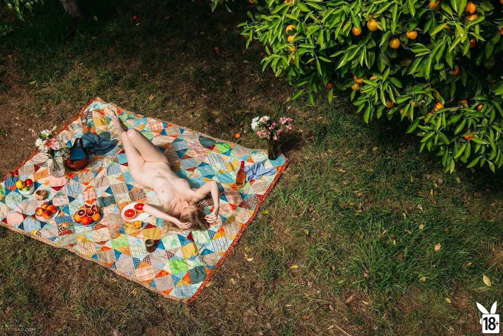 Модель раздевается в саду, показывая свое идеальное тело и естественные груди