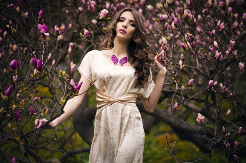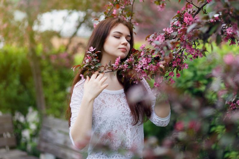Девушка красотка в расцветающем саду