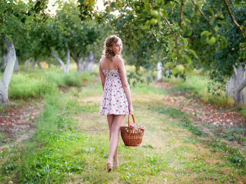 Девушка красотка собирает яблоки фото