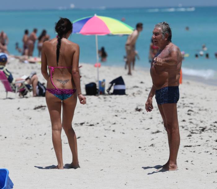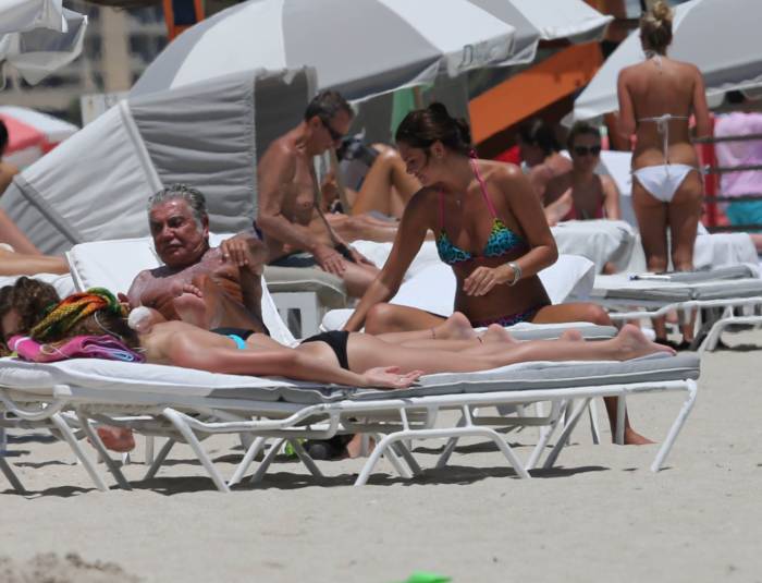 Знаменитый итальянский дизайнер Роберто Кавалли(73)и его спутница жизни модель Лина Нилссон загорают на пляже в Майами.