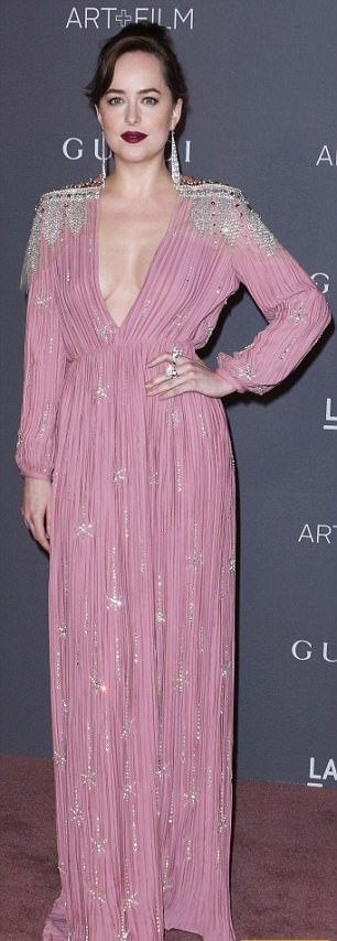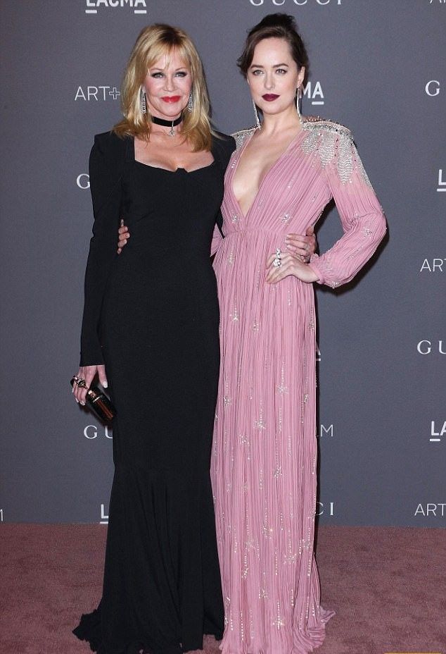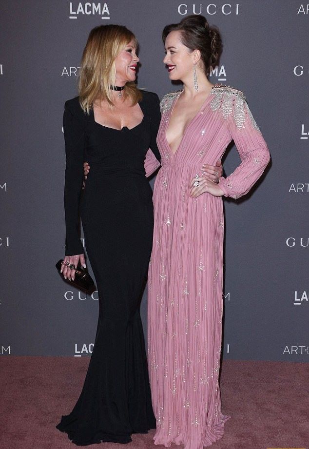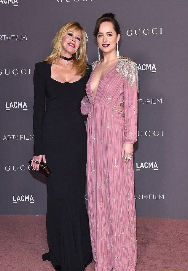 Звезда эротической трилогии «50 оттенков» Дакота Джонсон вместе с мамой, Мелани Гриффит, посетила в минувшую субботу 2017 LACMA Art + Film Gala в Лос-Анджелесе. 28-летняя актриса похвасталась глубоким декольте в длинном розовом платье.