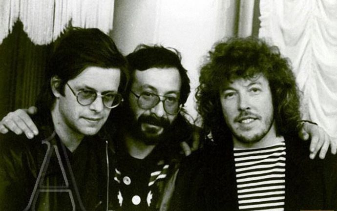 Валерий Сюткин («Браво»), Бутусов и Евгений Хавтан («Браво») обсуждают проблемы мировой музыки.