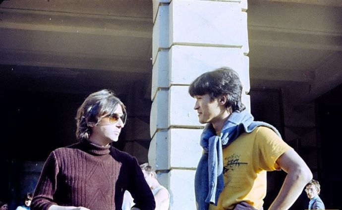 Майк Науменко и Виктор Цой в Свердловске. Вычитал тут в комментариях удивление, что Бутусов был знаком с Цоем. Конечно, был. И вот в этот заезд они и пили полночи вместе. А с Цоем, если что, и Летов был знаком. Дружбы просто не сложилось. Сергей Фирсов (заведующий фонотекой Ленинградского рок-клуба, директор клуба «Камчатка») много чего может поведать интересного, за что ему низкий поклон.