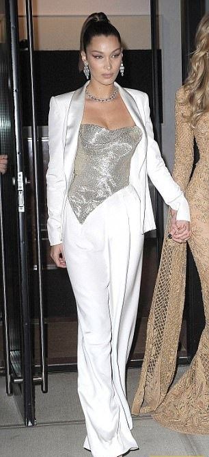 Невозмутимая Белла Хадид была облачена в белоснежный брючный костюм с откровенной асимметричной блузкой. В то время, как старшая сестра модели выбрала для торжественной церемонии более романтический образ - полупрозрачное платье цвета шампанского от модельера Zuhair Murad.