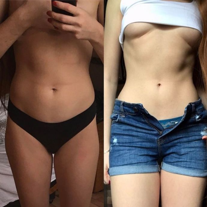 "Слева я придерживалась 'чистого' питания и считала, что целлюлит возникает от шоколадок. Фото справа — это моя форма сейчас, и я издавна не поддерживаю 'чистое питание', потому что считаю его бесполезным. Разве неизменные ограничения, срывы, булимия полезны?Неувязка излишнего веса кроется не в отдельных продуктах, а в профиците(излишке)калорий", — пишет женщина.