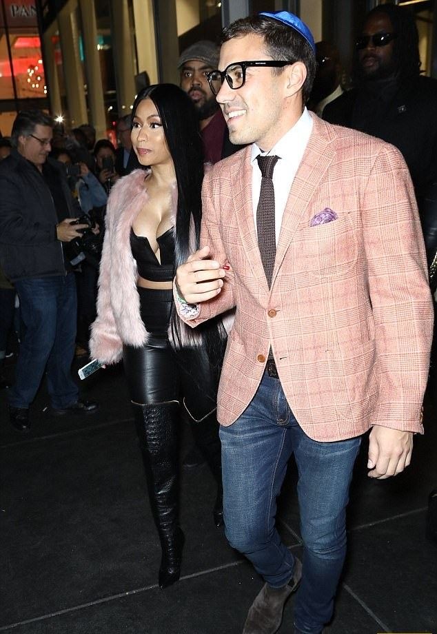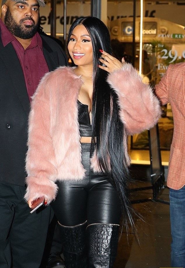 34-летняя знаменитость была облачена в узкие кожаные лосины и откровенный топ, едва сдерживающий её пышный бюст. Свой экстравагантный наряд Ники Минаж дополнила розовой шубкой и высокими сапогами из крокодиловой кожи.
