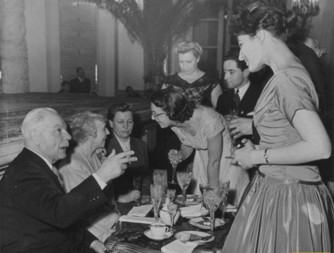 Сидят Климент Ворошилов, королева Бельгии Елизавета, Екатерина Фурцева. 1958 Год