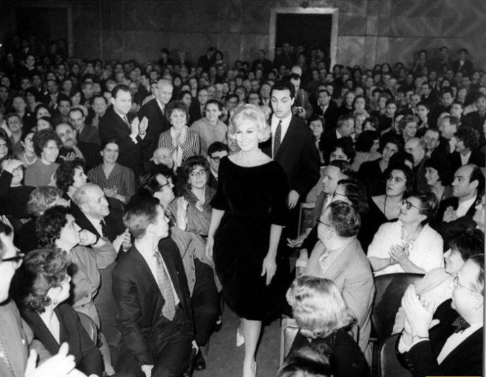 Американская актриса идет между рядами московских зрителей в сопровождении Казакова в 1962 году.