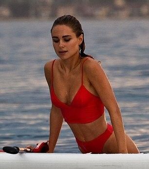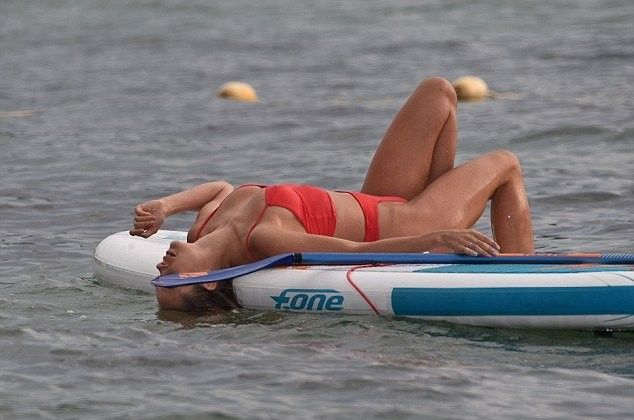 Сексуальная красотка, облаченная в откровенное красное бикини, ловит на себе восхищенные мужские взгляды, когда щеголяет по солнечному пляжу и купается в ласковых водах океана.