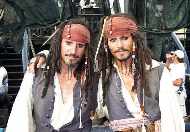 Джонни Депп и его дублер Тони Анджелотти на съемочной площадке «Пиратов Карибского моря».
