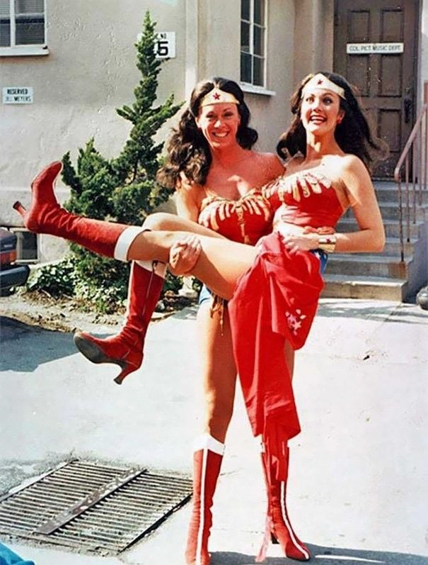 Линда Картер и ее дублер Джинни Эппер на съемках «Чудо-женщины».