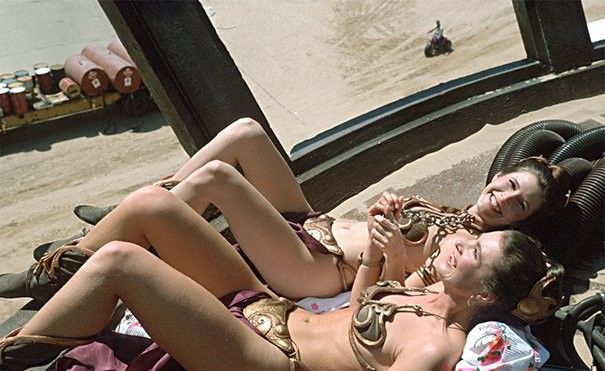 Керри Фишер и ее дублер Трейси Эддон загорают на съемках «Звездных войн».