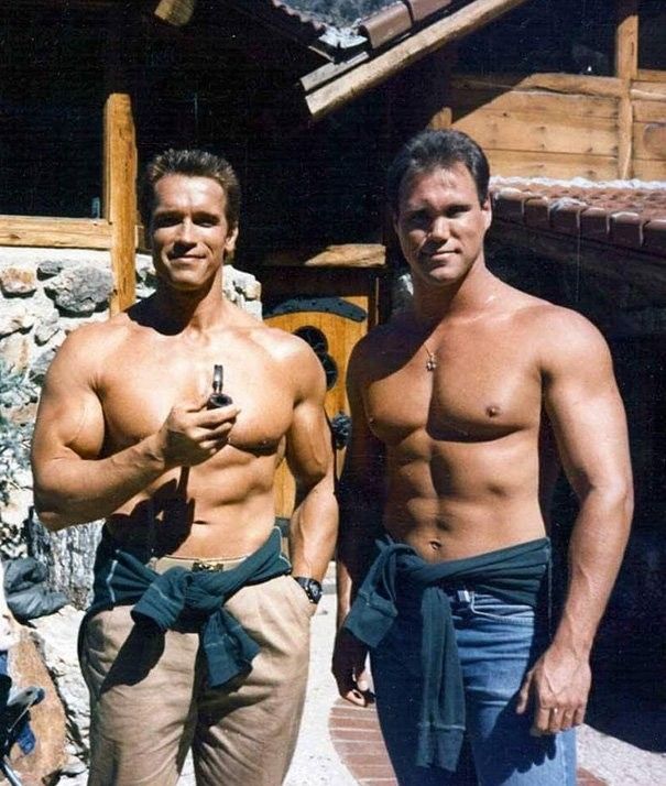 Арнольд Шварценеггер и его дублер Питер Кент на съемках «Коммандос».