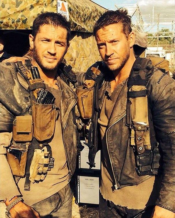 Том Харди и каскадер Джэкоб Томури на съемочной площадке фильма «Безумный Макс: Дорога ярости».