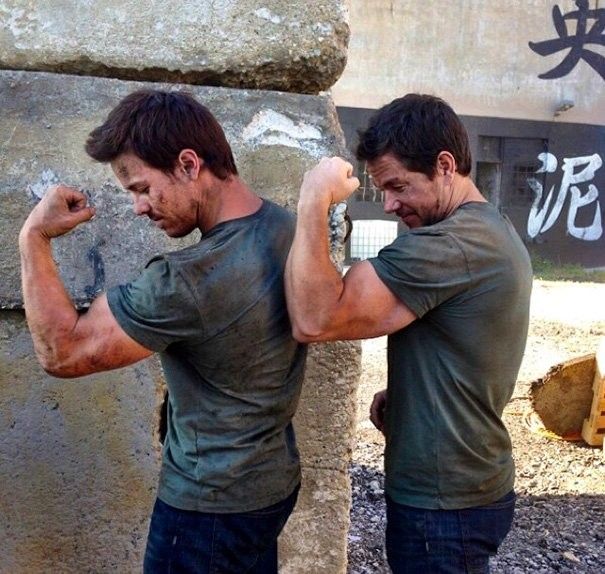 Марк Уолберг и его дублер Дэн Маст на съемках фильма «Трансформеры: Эпоха истребления».