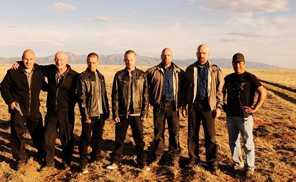 Джонатан Бэнкс, Аарон Пол и Брайан Крэнстон со своим дублерами на съемках сериала «Во все тяжкие».