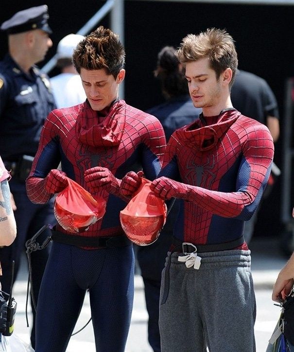 Эндрю Гарфилд и его дублер Уильям Спенсер на съемках «Человека-паука — 2».