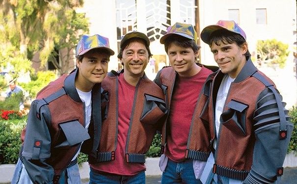 Майкл Джей Фокс и еще три Марти — Кевин Холлоуэй, Роберт Беннетт и Чарли Крофуэлл — на съемках фильма «Назад в будущее — 2».