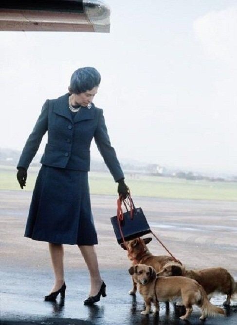 Елизавета II с собаками в аэропорту Абердина, 1974 год