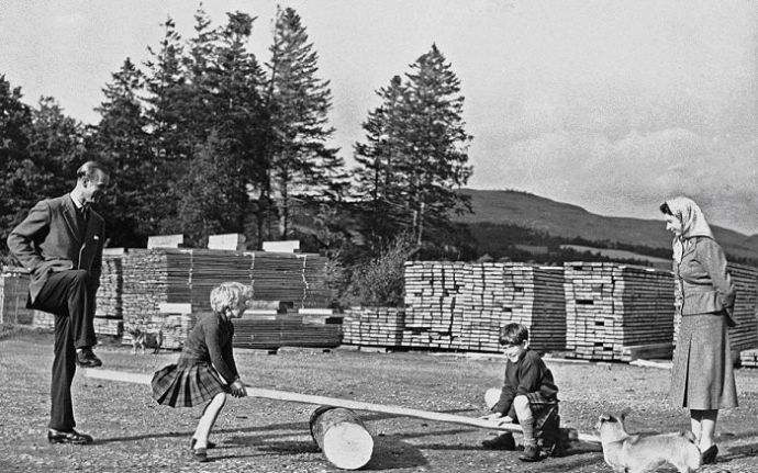 Принц Чарльз и принцесса Анна катаются на самодельных качелях на лесопилке в Шотландии, 1957 год