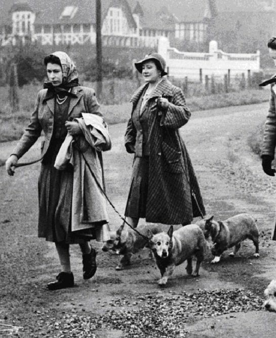 Британская королева Елизавета II и Королева-мать Елизавета прогуливаются с корги, 19 ноября 1956 года