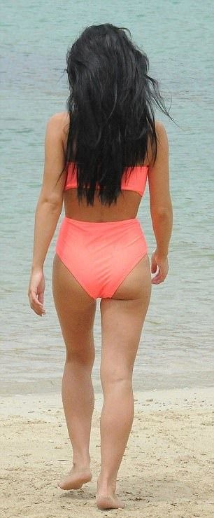 Эффектная брюнетка в стильном коралловом купальнике затмила всех, когда купалась и загорала на берегу Атлантического океана.