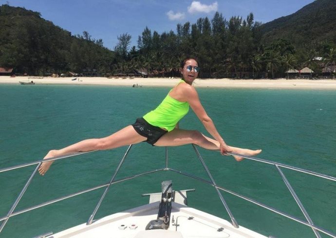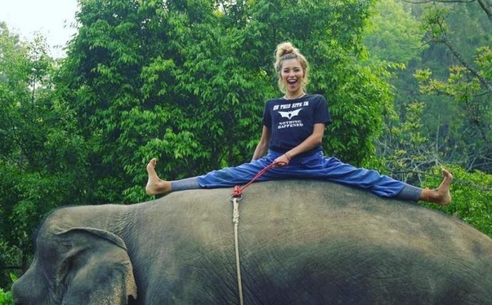 Регина Тодоренко, ведущая телевизионной программы «Орел и Решка», исполнила шпагат прямо на рабочем месте, непосредственно на слоне.