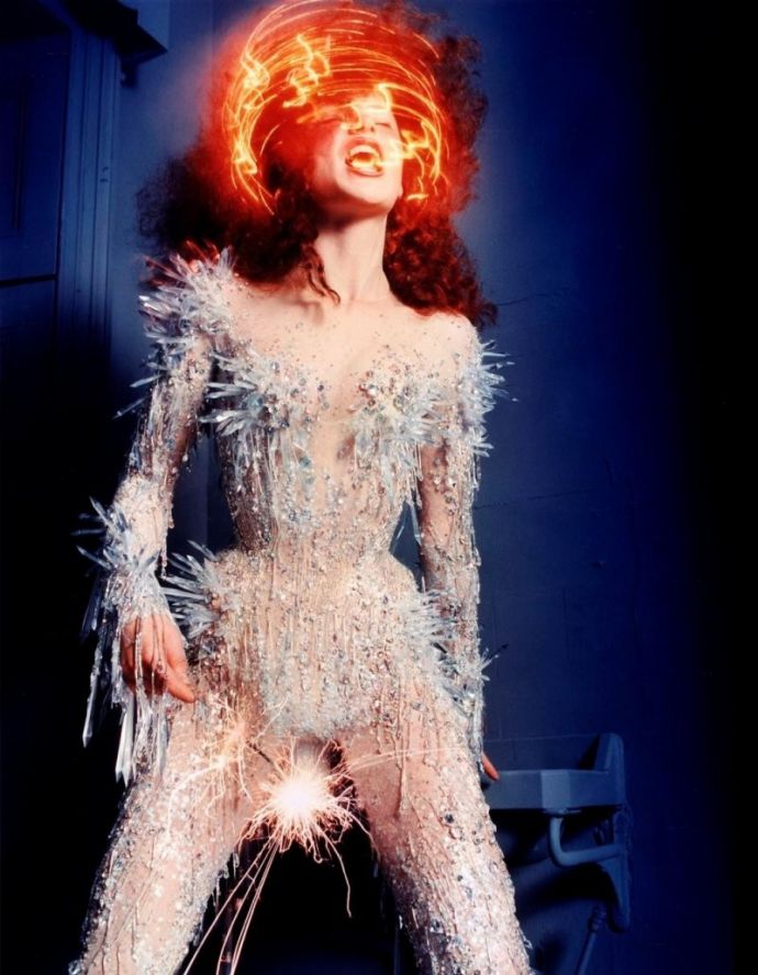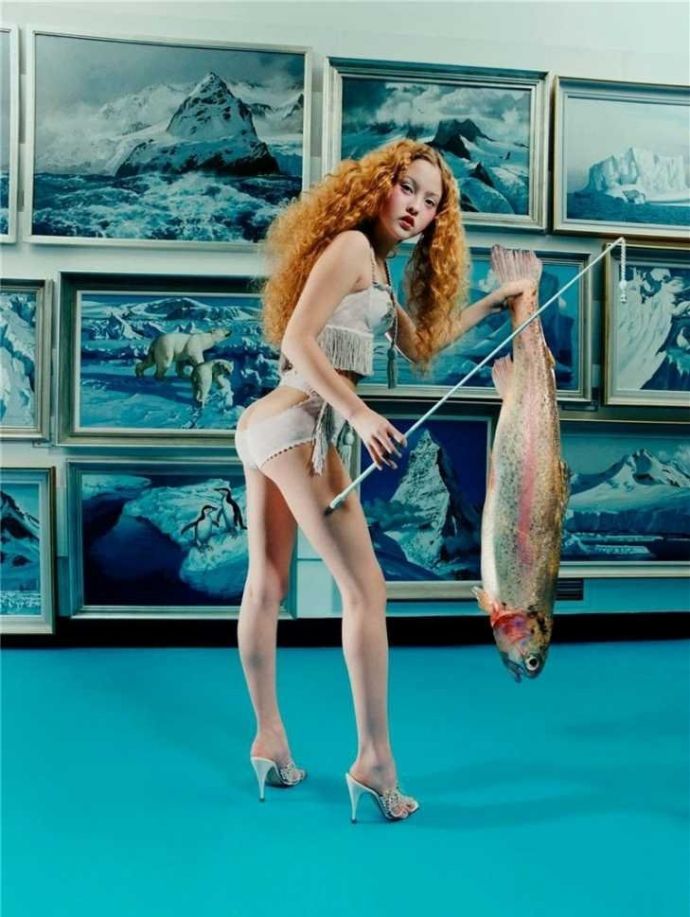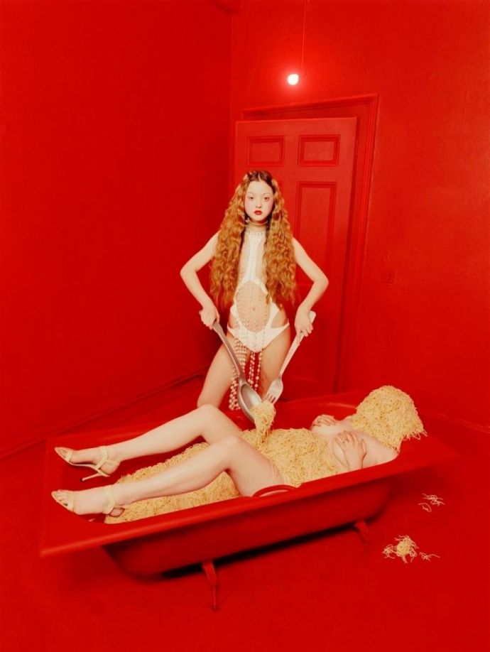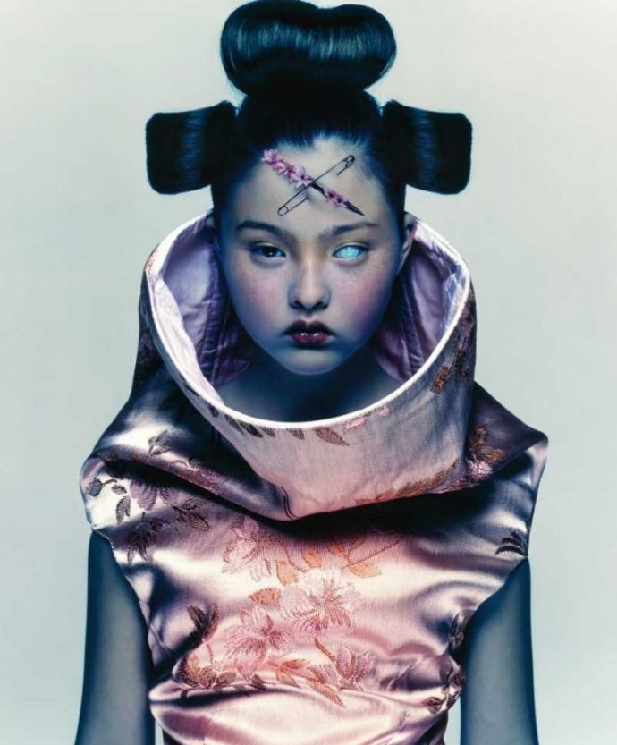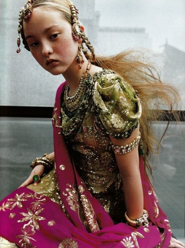 Экзотическая внешность модели находит воплощение в национальных мотивах. Вот она в японском кимоно или просто девочка в стиле аниме. Ещё ярче выглядит Девон в индийском сари. Модель создала множество совершенно фантастических персонажей, вроде сумасшедшего повара в красном, подающим человека в соусе с пастой.