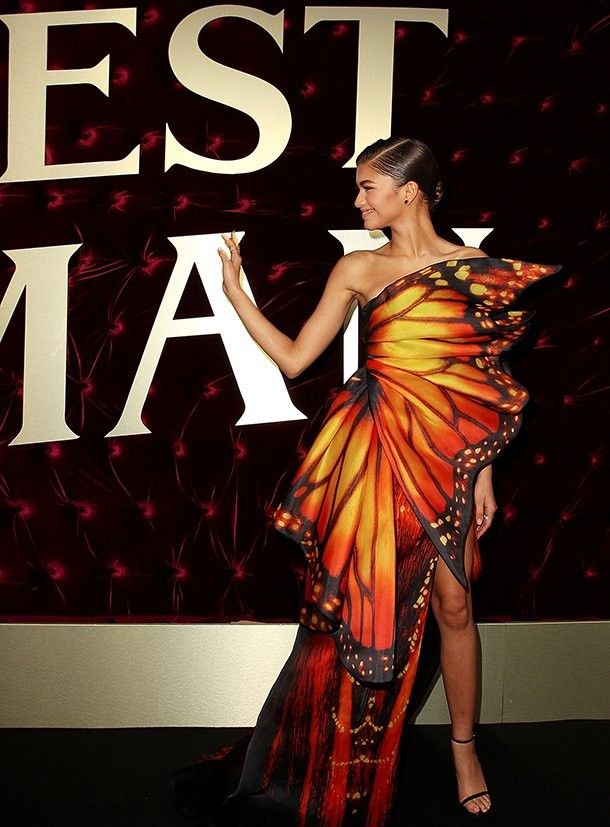 Девушка не прогадала. Дождик не смог помешать ей стать звездой вечера. Необычно эффектное платье «бабочка-монарх» подчёркивало своеобразную красоту актрисы. Ассиметричные разрезы платья при каждом движении создавали новые ракурсы.