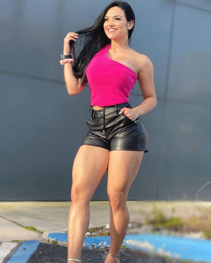 Так как она является спортсменкой в категории «Bikini Wellness», то низ тела она должна тренировать особенно усердно, поэтому ноги она тренирует 2-3 раза, а верх 2 раза в неделю.