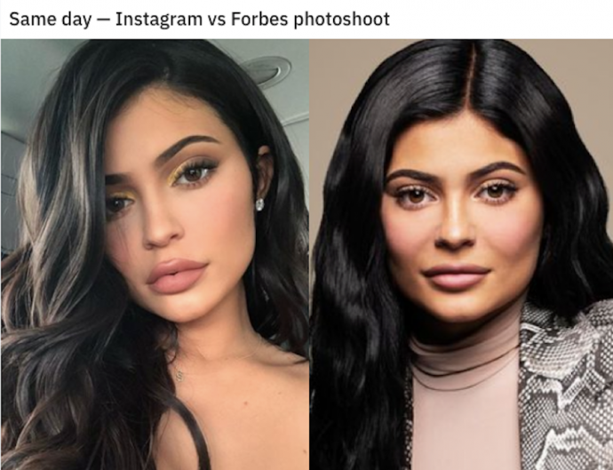 Вот пример из жизни Кардашьян- отредактированного фото в Инсте и отофотошопленного снимка для глянцевого журнала Форбс, изготовленные в один час и один день.
