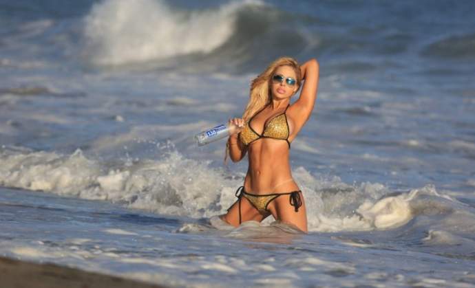 итальяно-венесуэльская модель и дизайнер Франческа Ларраин(Francesca Larrain)позирует в бикини и топлес для маркетинговой фотосессии воды 138 Water на пляже в Малибу.